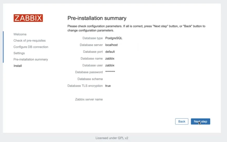 Bu özette önceden girilen tüm değerleri kontrol edin ve ardından Next step kurulumu tamamlamak için tıklayın.